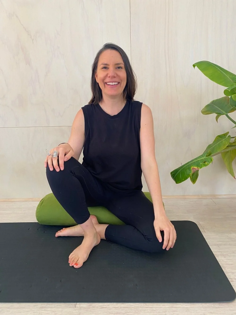 Sit facing the side on your mat and bring one of your shins parallel to the long edge of your mat. Bend the other leg so that your toes are pointing behind you and your knee is sitting in the arch of you other foot.