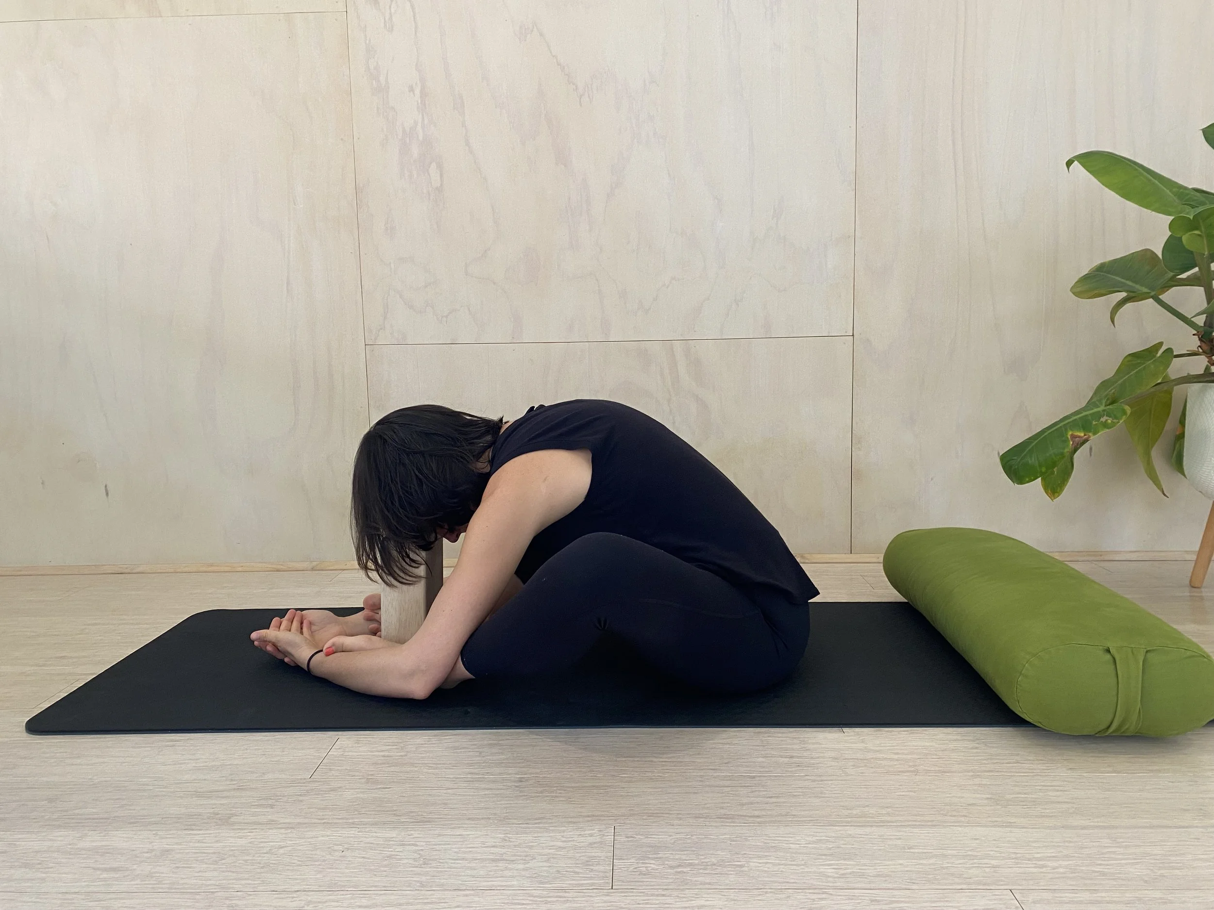 Bring the soles of your feet together in front of you, be intuitive in your body and choose a distance that feels right for you. Let your knees drop out to the side. You can place blocks or pillows under your knees to offer your hips support.
