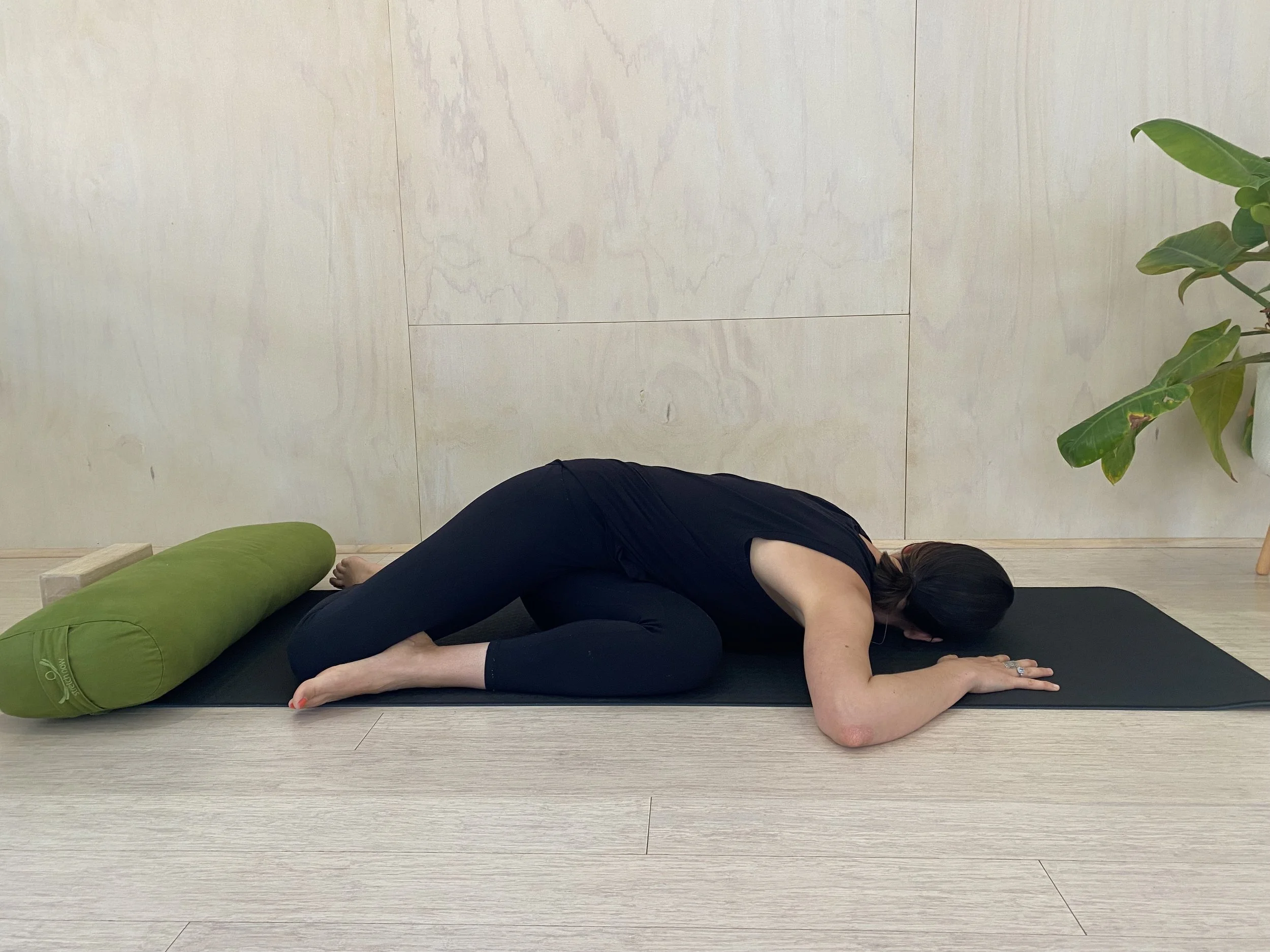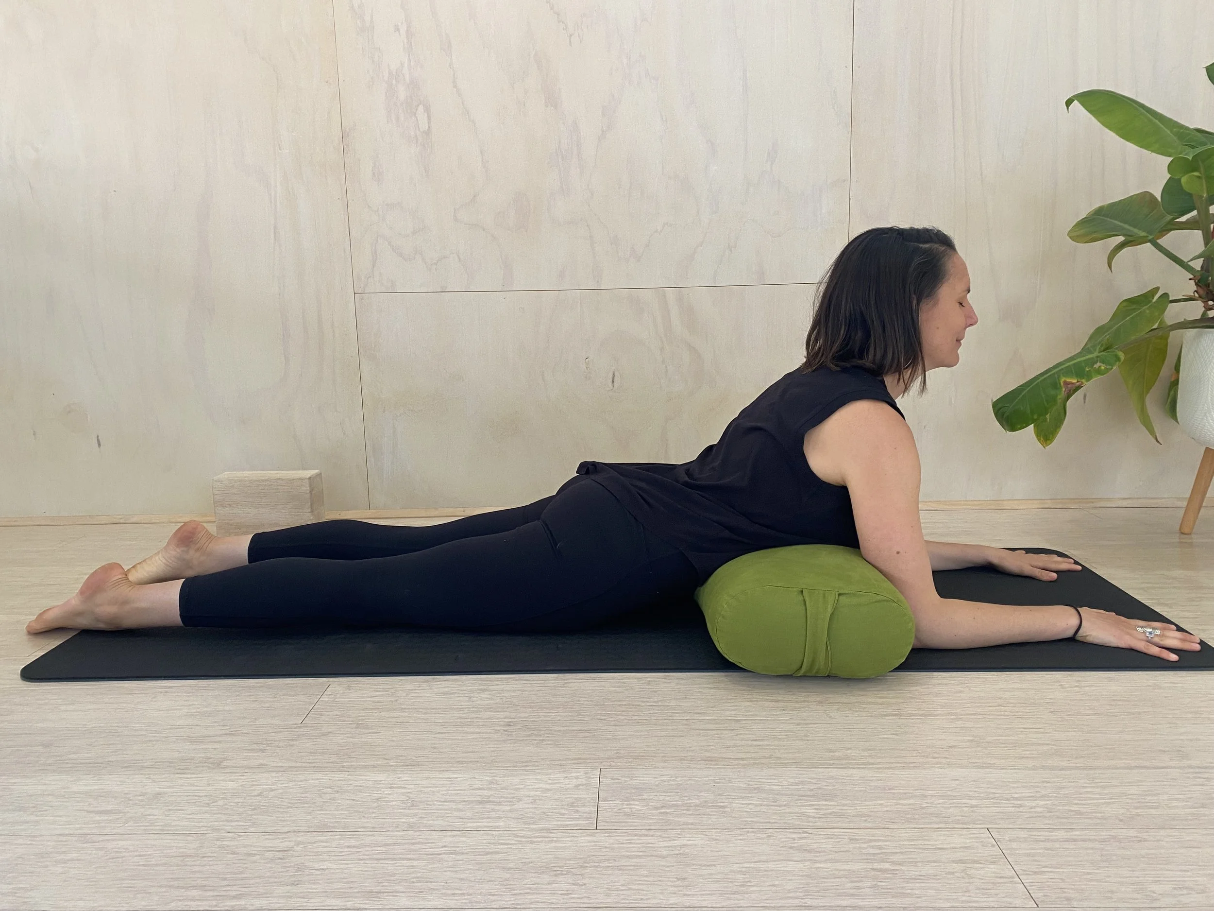 Place the bolster lengthways next to your hip. You are going to turn to face the bolster then lay yourself down so that your belly, chest and head are supported.
