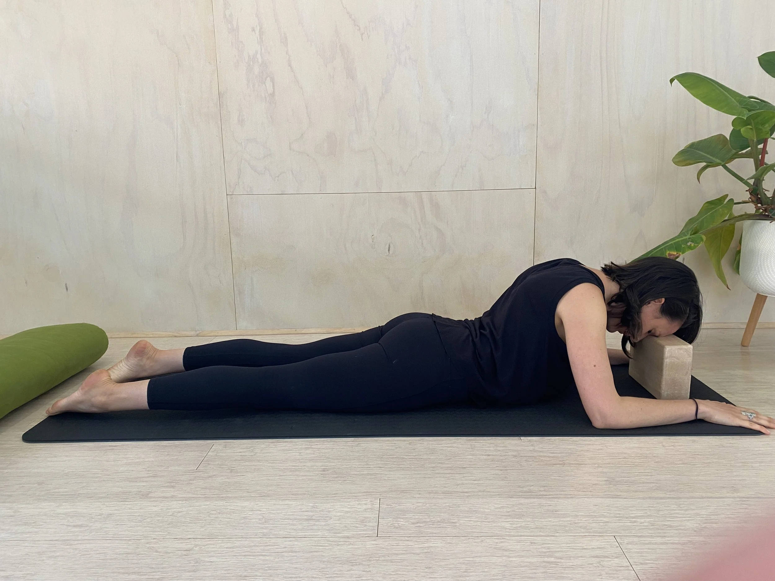 Roll onto your tummy, lift your chest and bring your elbows under your shoulders, forearms on the floor parallel to each other and hands out in front of you. Your legs are out long behind you. You can place a block in front of you, so you have something to rest your forehead onto or keep your neck long and gaze towards the tops of your fingers.