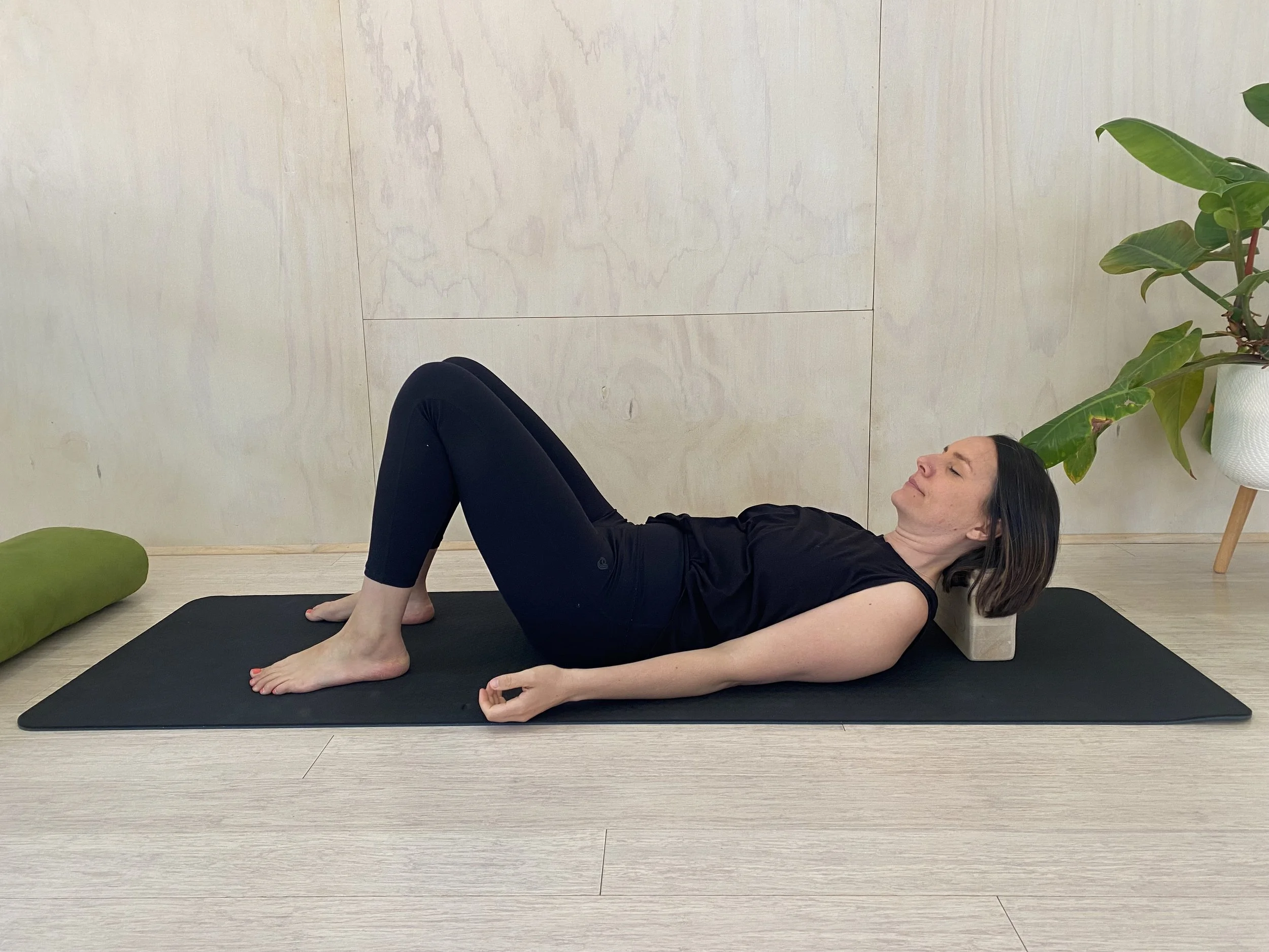 Laying on your back place a block underneath your neck. You can leave the block flat or hold it so that you have the corner of the block pressing into your neck to create a deeper release. Slowly move your neck from side to side to massage out any tension and sensation you feel. As you are working with the throat chakra which is our centre of expression it can be really helpful to sigh, cough, moan or vocalise to help and stuck energy move.