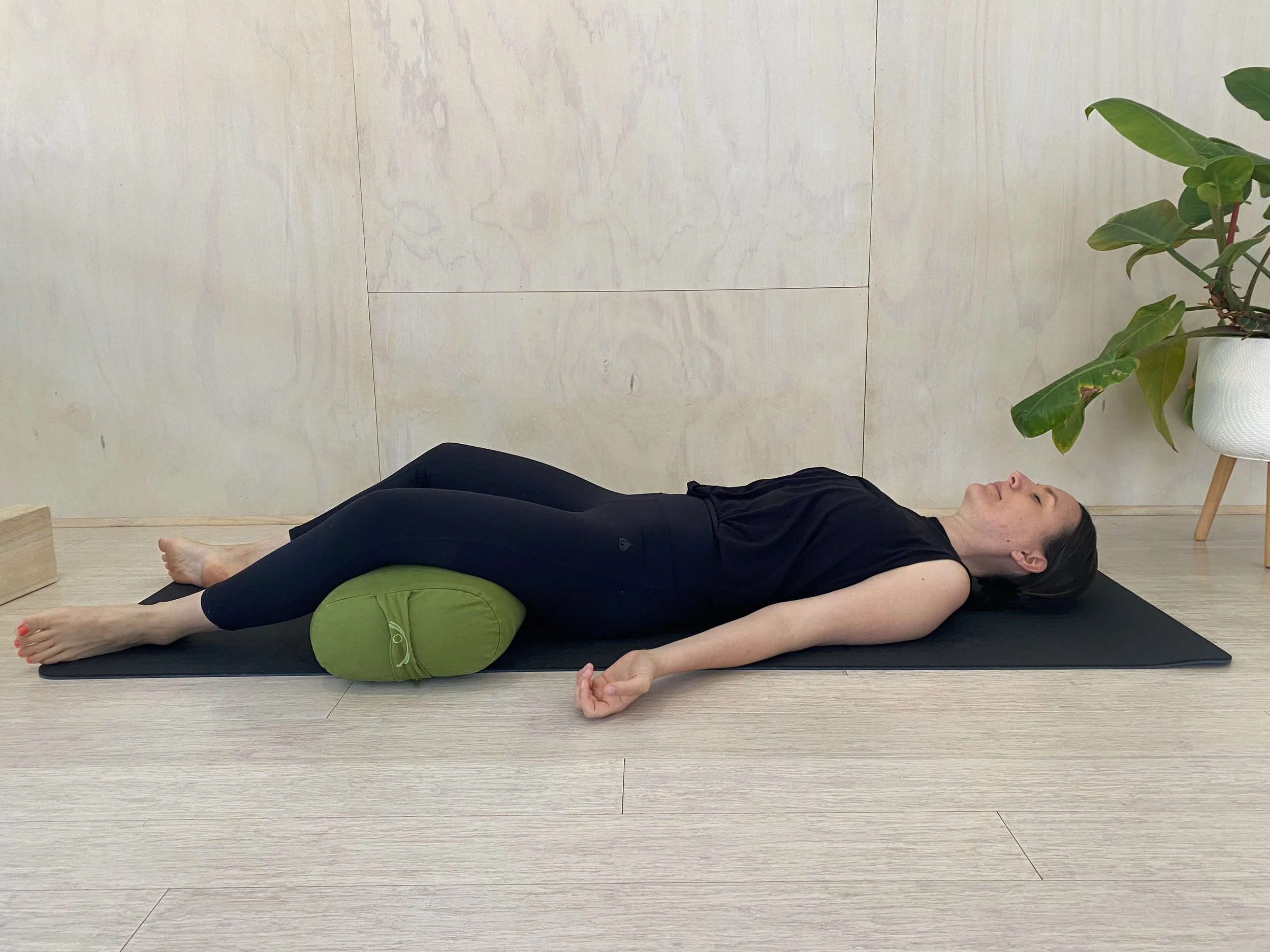 Place a bolster lengthways along your mat or use two blocks (one for under your head and one between the shoulder blades). Lay down onto your back and make sure your chest is opened towards the sky. You can open your arms out to a T shape besides you to extend the opening all the way down to your fingertips. When you breath imagine your chest is opening in all four directions. It can help to take five breaths in a row. With the first breath feel your chest rise and fall, with the second breath feel the right rib cage open and then close, with the third breath feel the back of the shoulders open and close, with the fourth breath feel the left rib cage open and close and then with the fifth breath feel all four directions expand and then contract.