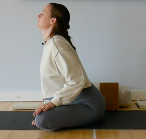 Find your way into a seated position on the edge of your bolster. Rock the pelvis slightly forward and lengthen the tailbone downward. Imagine your pelvis as a basin of water that is tilted forward a bit. The element of water is associated with the sacral chakra. Observe your fluidity as you practice today.