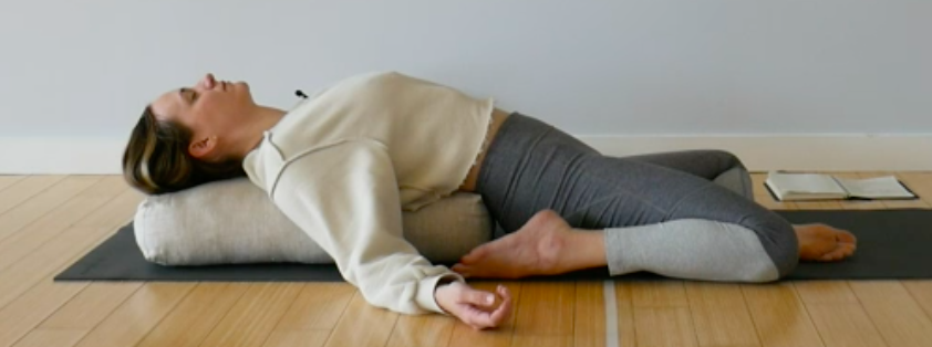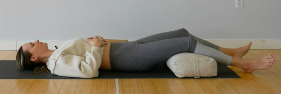 Close your practice with a long savasana, Consider sliding a bolster under the knees to alleviate any pressure in the lower back so the energy can freely travel up the spine.
