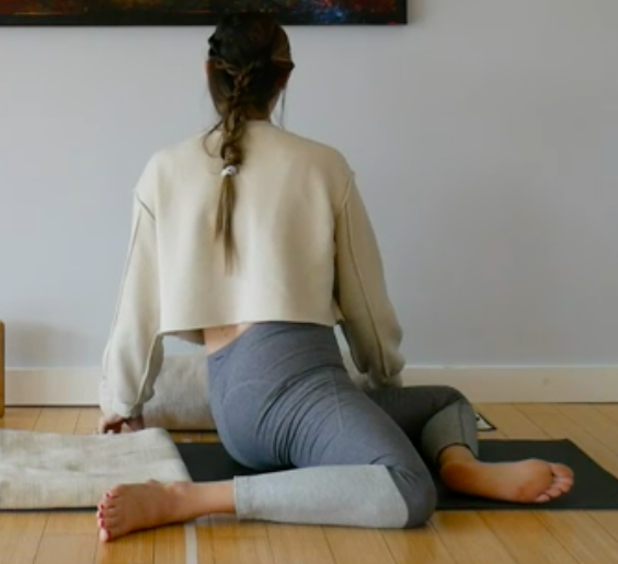 Position yourself in a half saddle with one leg bent at your side. You can turn the foot outward (onto the big toe side) or keep the top of the foot to the floor. The other leg can stretch forward or drop open into a half butterfly. Sit onto a pillow if you need a little lift. Recline back slowly to your hands, forearms or down to your spine. Take your time as you find your way into this one.