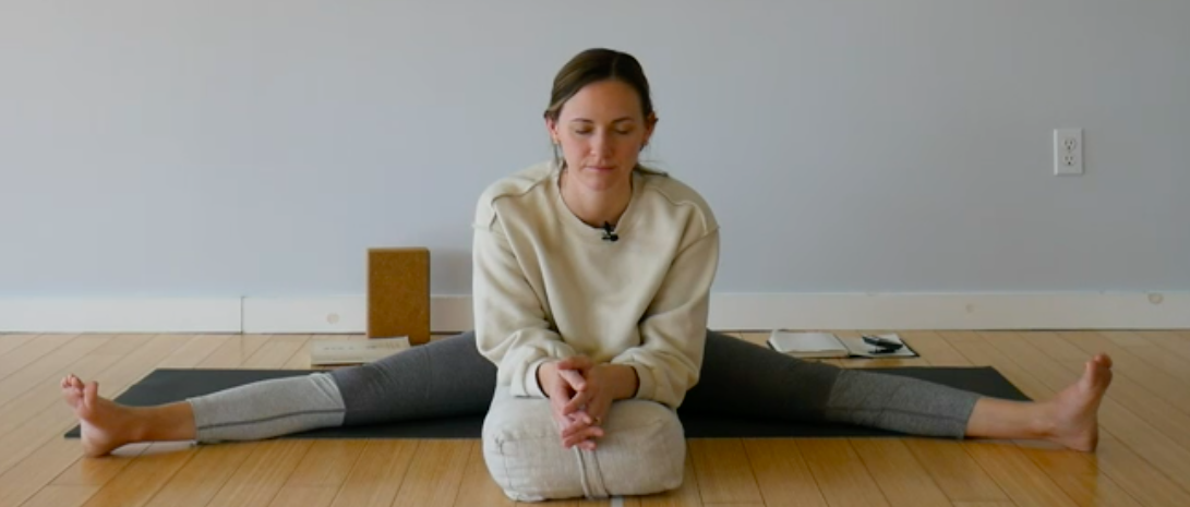 Open the legs into a wide V position. Place a bolster at the groin and slowly fold forward. Take your time to settle in and release here.